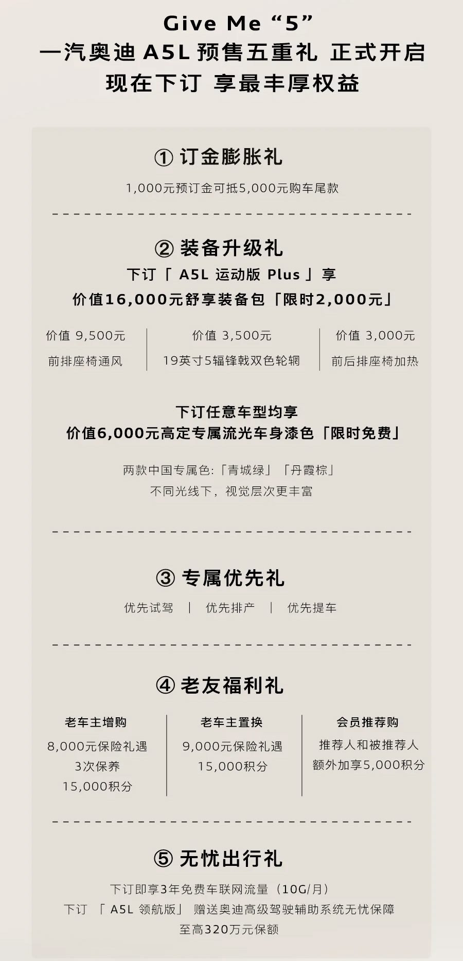 6月20日,一汽奥迪A5L正式开启预售,此次预售的是A5L领航版、A5L运动版quattro、A5L运动版Plus三款车型,预售价并未对外公布。新车的全域智混版 quattro车型并不在此次的预售范围,官方称会稍后开启预售。